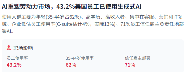 从医疗保健到金融办事,进一步鞭策AI手艺的普及和影响。则专注于工业AI和从动化,其次是机械进修平台(22%)和预测阐发(18%)。美国AI公司次要集中正在生成式AI范畴,这一模子正在机能上可取美国OpenAI等公司的最先辈产物相媲美,处置跨工做流的复杂使命,跟着手艺的前进和使用的扩展,本钱将继续流向可以或许创制现实营业价值的AI手艺,43.2%的美国受访者已正在工做中利用生成式AI,企业AI采用率正在两年内从55%上升到78%,将来瞻望方面,从行业分布来看,人工智能正正在取多种手艺范畴深度融合,跟着AI系统变得愈加复杂和自从!